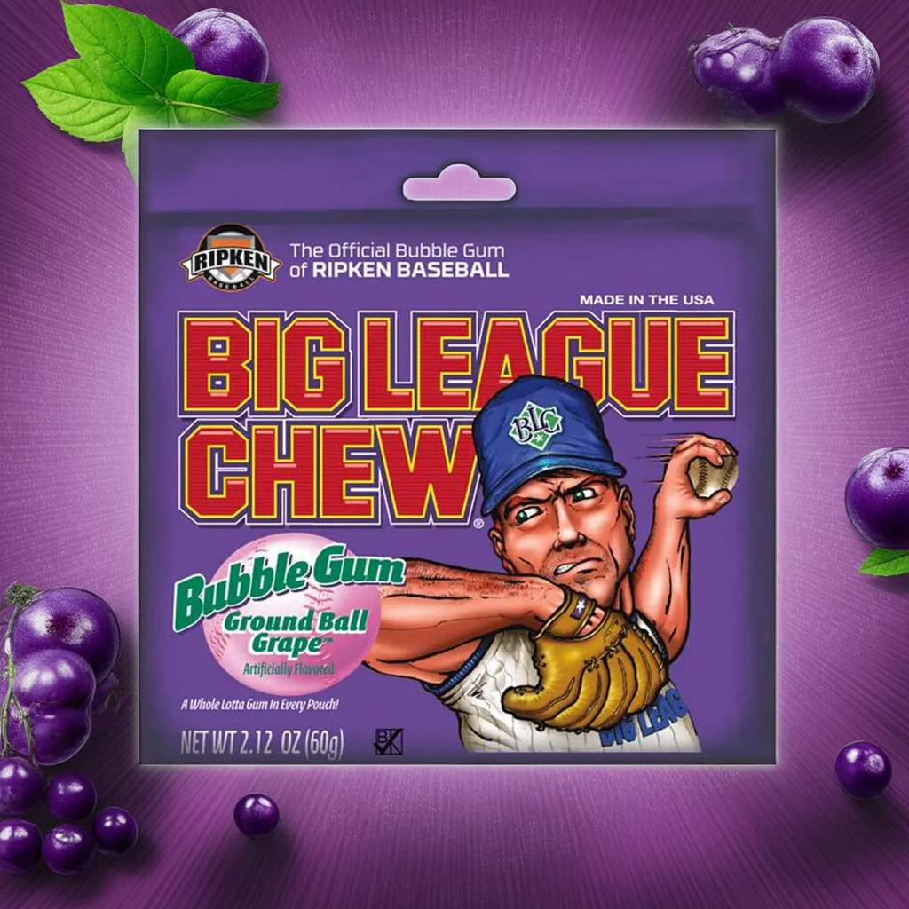 The Ball Players' Gum, for major leaguers of all ages. Shredded bubble gum in a folding foil pouch that keeps the juicy grape flavour locked inside.