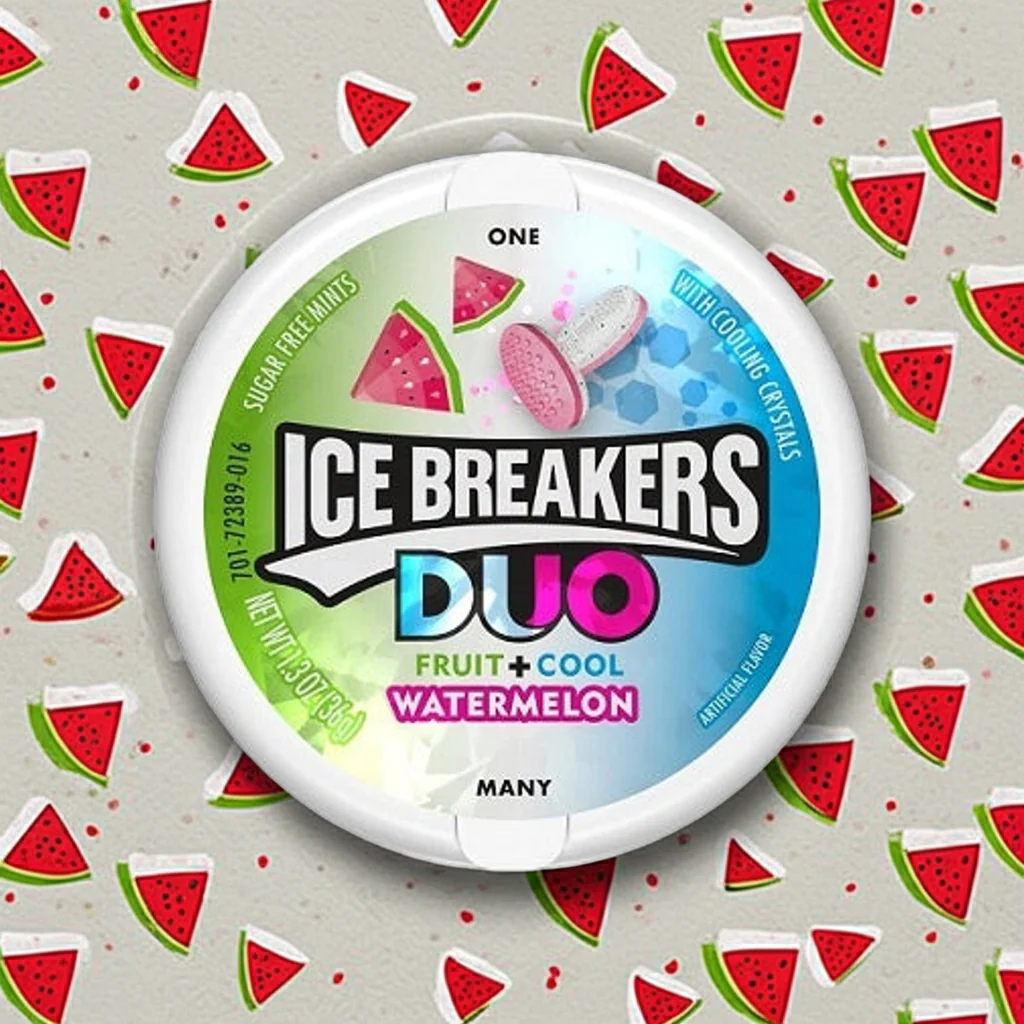 Ice Breakers duo fruit + cool watermelon - get an empowering watermelon boost from this singular combination of fruit and mint in Ice Breakers duo mints. Kind of like a refreshing snow squall on your hot summer picnic.