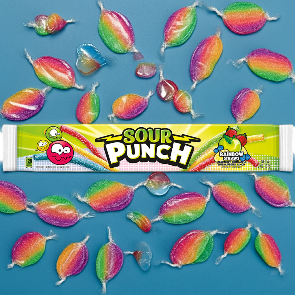 Sour Punch Rainbow Straws are in tasty Strawberry, Apple, Blue Raspberry, Cherry, or Watermelon flavours. They are perfect for sipping your favourite drink.